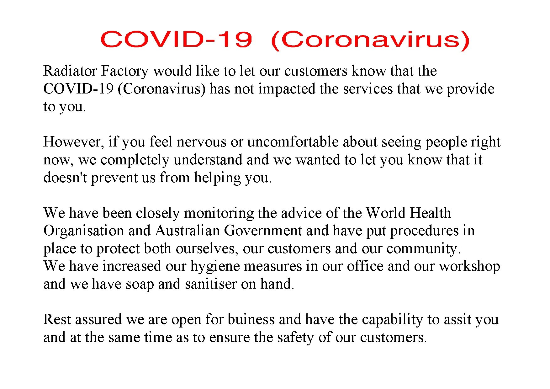 Radiator Factory would like to assure our customers that we are still open for business during the (COVID-19) Coronavirus. We have taken all precautionary measures to ensure our premisis are wiped down regularly and sprayed with bactarial spray. We can still continue to work in a safe environment. So come along and support our small business, we can still do all the same things as normal we can service, clean and repair radiators, we can supply new radiators and install them too, we also do flushing of your cooling systems and changing of coolants. We can also still clean and repair fuel tanks.